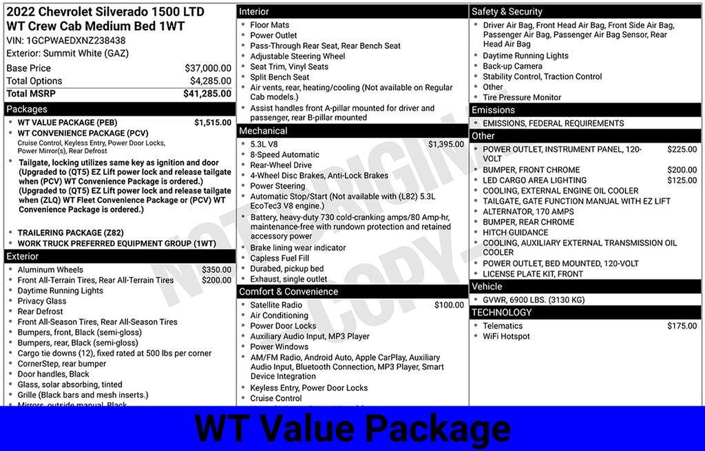 Silverado 1500 LTD Work Truck, 3.5" Monochromatic Display Driver Info Center, Black (Semi-Gloss) Front Bumper, Black (Semi-Gloss) Rear Bumper, Black Grille, Black Manual Outside Mirrors, Bluetooth® For Phone, Deep-Tinted Glass, Electric Rear-Window Defogger, Electronic Cruise Control, EZ Lift Power Lock & Release Tailgate, Heated Power-Adjustable Outside Mirrors, Hitch Guidance, Locking Tailgate, Manual Tilt Wheel Steering Column, Power Door Locks, Power Rear Windows w/Express Down, Preferred Equipment Group 1WT, Rear 60/40 Folding Bench Seat (Folds Up), Remote Keyless Entry, Rubberized-Vinyl Floor Covering, Solar Absorbing Tinted Glass, Standard Tailgate, Trailering Package, WT Convenience Package, WT Value Package.