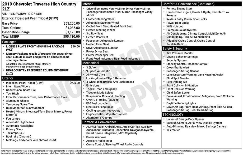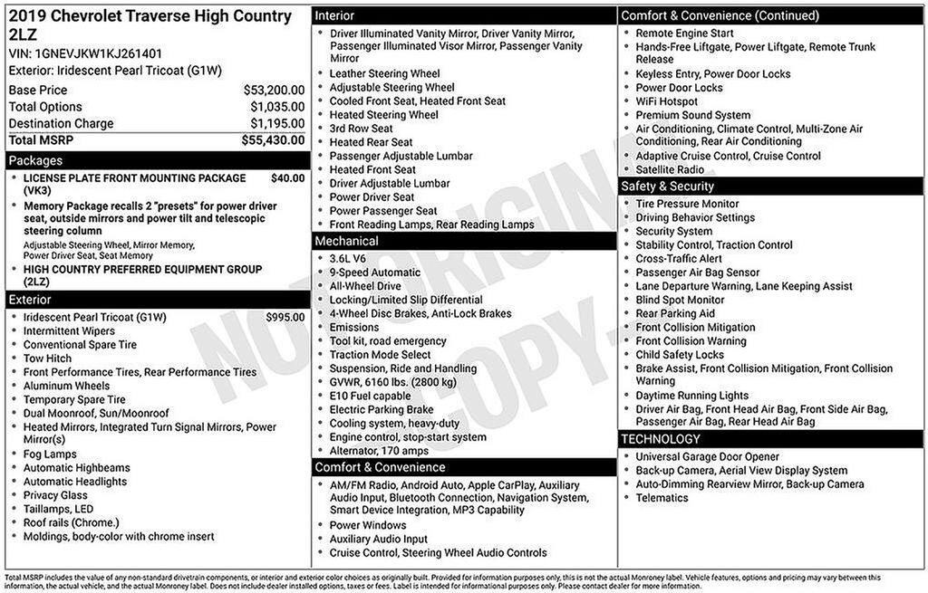 Iridescent Pearl Tricoat 2019 Chevrolet Traverse High Country AWD 9-Speed Automatic 3.6L V6 SIDI VVT